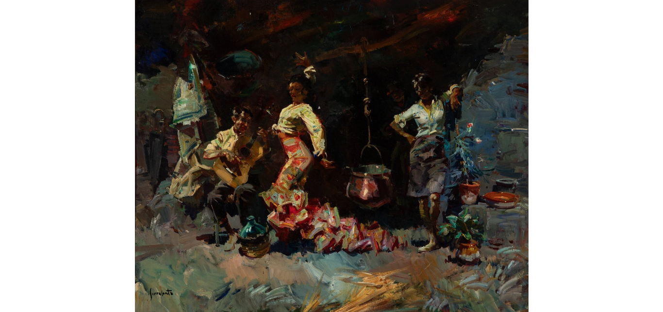Aunque no fue un pintor taurino en sentido exclusivo, el lado animal y taurino sí forma parte de su repertorio. El mercado ha documentado obras como Torero, Bueyes, Perros de caza, Cazador, Escena de montaña con figuras y bueyes y Jauría atacando al jabalí. Ahí se ve con claridad que el animal no le interesaba como simple adorno, sino como masa, empuje, musculatura y tensión. El toro, el perro de caza o la yunta encajan de manera natural en su lenguaje: espátula viva, color corpóreo, dramatismo de la materia y una atención muy española a la relación entre el hombre, la tierra y la bestia. Más que un especialista del ruedo, fue un pintor al que la bravura y la fisicidad animal le venían de dentro de su propio sistema plástico.