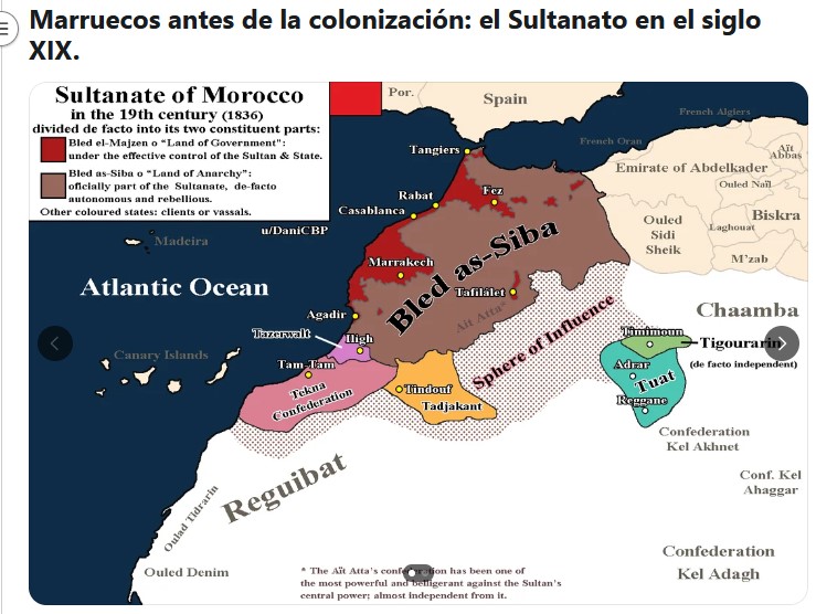Marruecos, zona con gobierno, color granate; y zona fuera del control del Sultán