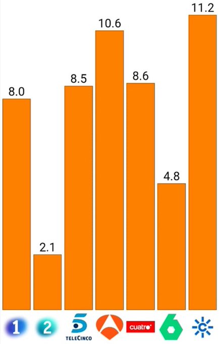 Antena 3 y Canal Sur atraen al 21.8% de los andaluces. El resto de las cadenas de tv son anti PP (y anti VOX y anti todo lo que suena a la nueva moda de Europa). Suman un 32% entre las cinco cadenas nacionales. La diferencia es de 10.2 puntos. Ahí hay cientos de miles de votos.