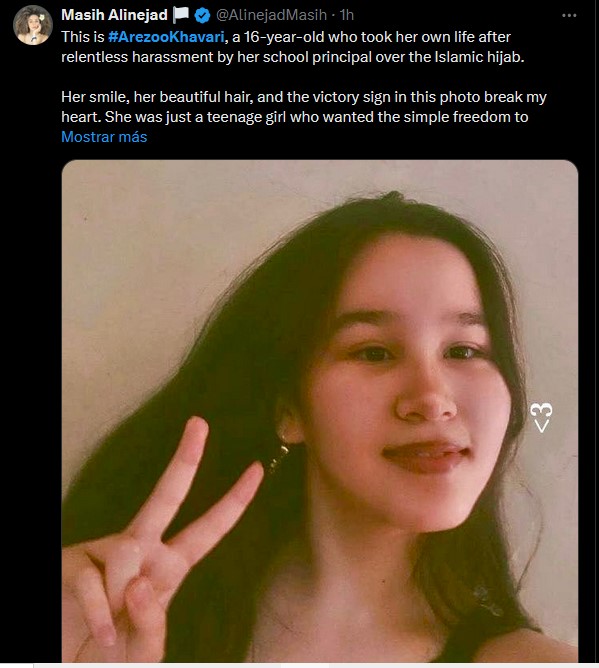 Esta es #ArezooKhavari , una joven de 16 años que se quitó la vida después de sufrir un acoso implacable por parte del director de su escuela a causa del hijab islámico.