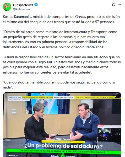 Pongamos las cosas en perspectiva y comparemos la reacción de un ministro de Transportes de Grecia ante un accidente que costó decenas de muertos. Y la actitud de Pedro Sánchez, y su ministro, Óscar Puente: