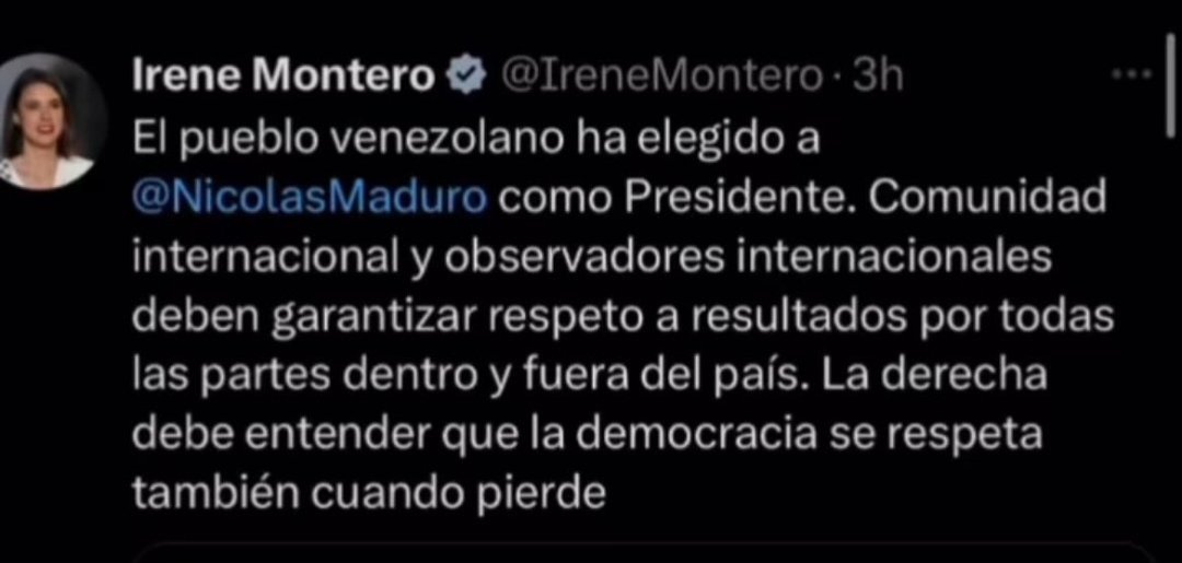 Irene Montero desconoce el cometido de los observadores internacionales. Estos no están para reconocer al "ganador" están para verificar que la elección ha sido limpia... y esta vez hay unanimidad entre los demócratas: hubo fraude. Zapatero y Monedero no cuentan como observadores.