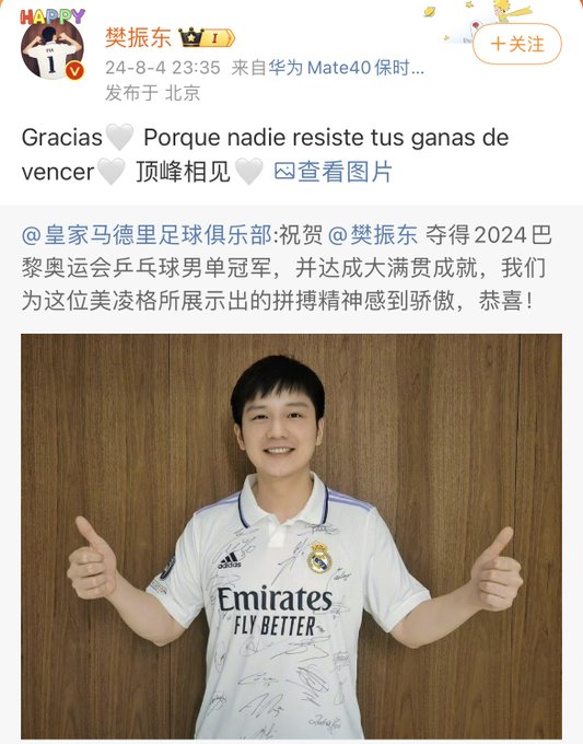 Fan Zhendong, Medalla de Oro en ping-pong individual en los Juegos ha subido una fotografía a sus redes diciendo que es el medallista de oro... y se ha puesto la camiseta oficial del Real Madrid, club del que es seguidor.