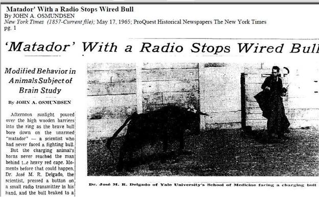 José Manuel Rodríguez Delgado fue un fisiólogo español conocido por sus experimentos de control del cerebro mediante estimulación eléctrica. En 1963, realizó un famoso experimento en una plaza de toros en España, donde utilizó un dispositivo de radio para detener a un toro en plena carga. Este experimento, que buscaba demostrar el control del comportamiento agresivo del animal a través de estímulos eléctricos en el cerebro, fue ampliamente publicitado y generó controversia sobre la posibilidad de control mental.