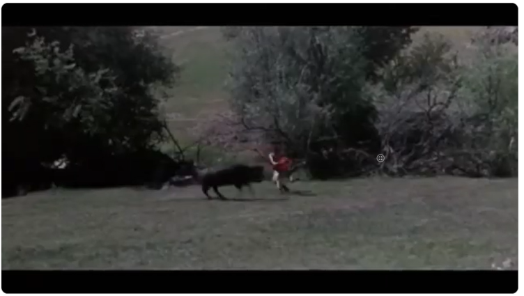 Unos cortes de la famosa escena de Alain Delon como torero en el campo citando, dando un pase y saludando la faena a una vaca: