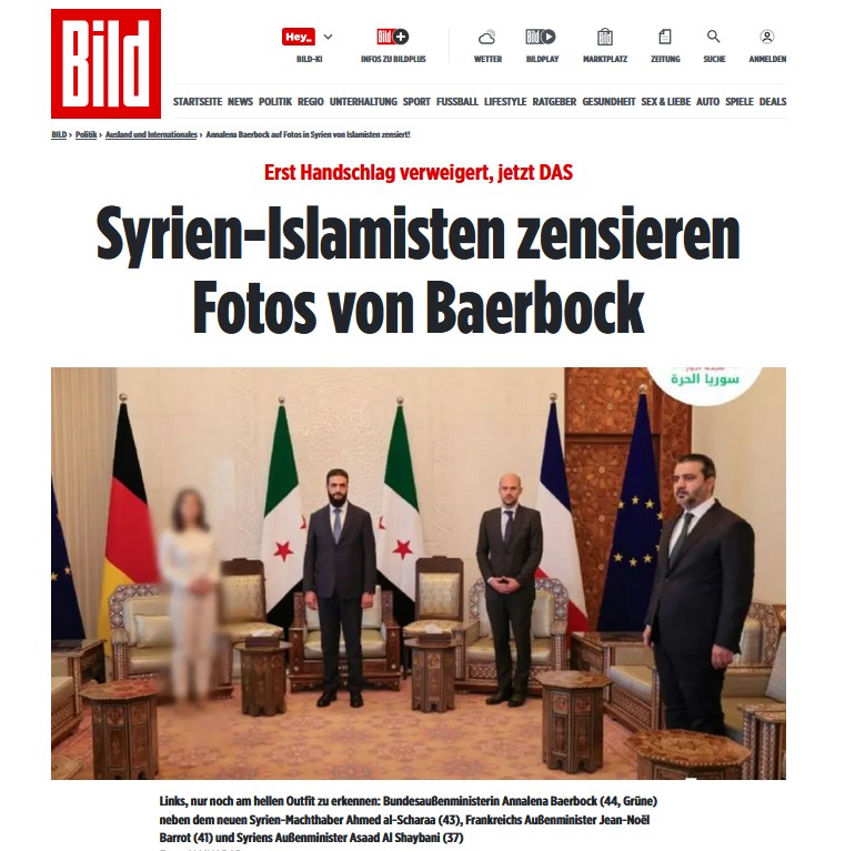 Educar a los musulmanes será un camino largo o imposible. Esta es la foto oficial del gobierno sirio para la visita de la ministra de exteriores alemana Annalena Baerbock: foto oficial con "la ministra" pixelada.