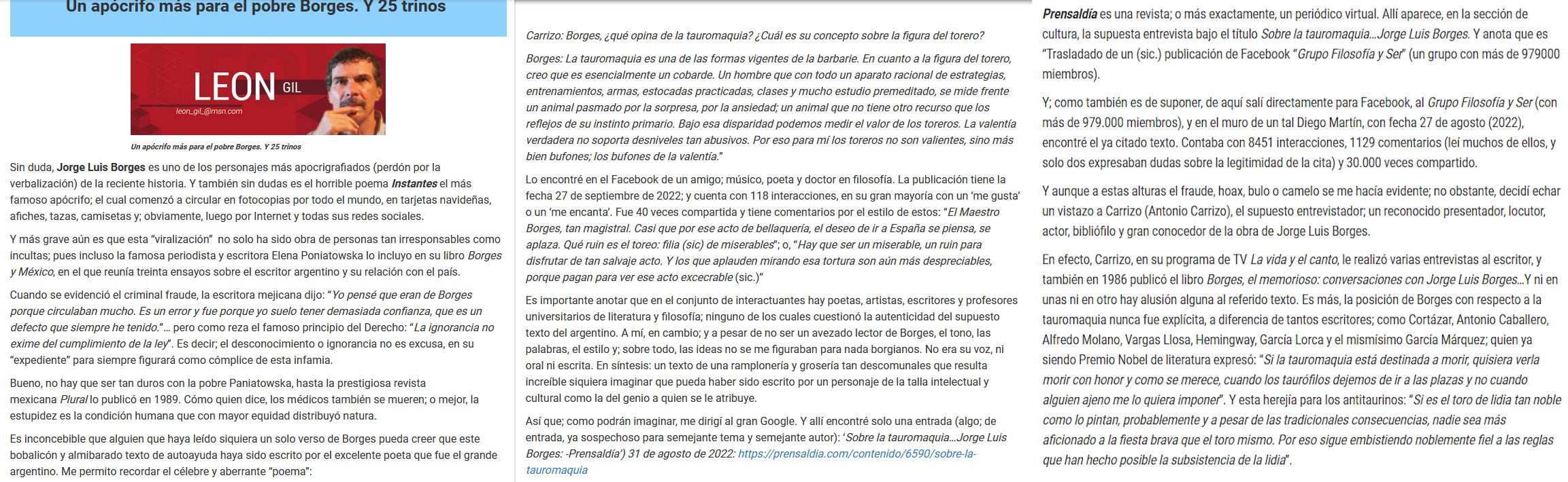 El poeta colombiano León Gil se ha tomado la molestia de verificar una "cita" del escritor de fama mundial Jorge Luis Borges que rueda sin parar por las redes sociales. Es una cita contra los toreros, y contra la tauromaquia. El poeta colombiano León Gil, después de interesantes verificaciones, certifica que es una falsa cita; un bulo. Una falsedad atribuida a Borges. Otra de las muchas "falsas citas" atribuidas al laureado escritor argentino, que comparte con Churchill, el orondo político inglés, el podium de las personalidades del mundo con más citas falsas atribuidas. Vamos con la de Borges. O mejor, os enlazo y llevo al original, del que guardo a buen recaudo y muestro -para los que por las prisas tenéis muchos "pa'luegos"-, os muestro a todos, decía, un retazo esencial de esa cita que descarta de modo cierto y por tanto taxativo, la falsedad de la misma y su descenso al nivel de "bulo circulante"