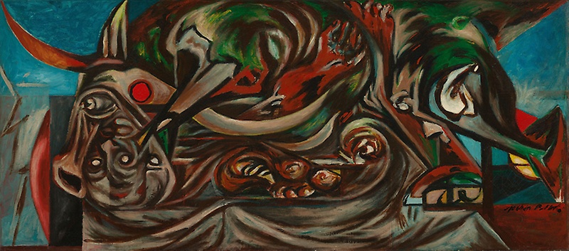 La influencia española también estuvo presente en su obra, especialmente a través del contacto con la pintura de Pablo Picasso. La visión de "Guernica" en una exposición del MoMA en 1940 marcó profundamente a Pollock, quien adoptó elementos de la descomposición figurativa y la intensidad emocional del maestro español. Además, su fascinación por la tauromaquia como ritual cultural también dejó huella en su lenguaje visual. Obras como "Untitled" (1938-41) evocan la tensión y el movimiento de una corrida de toros, en un guiño a las tradiciones españolas.