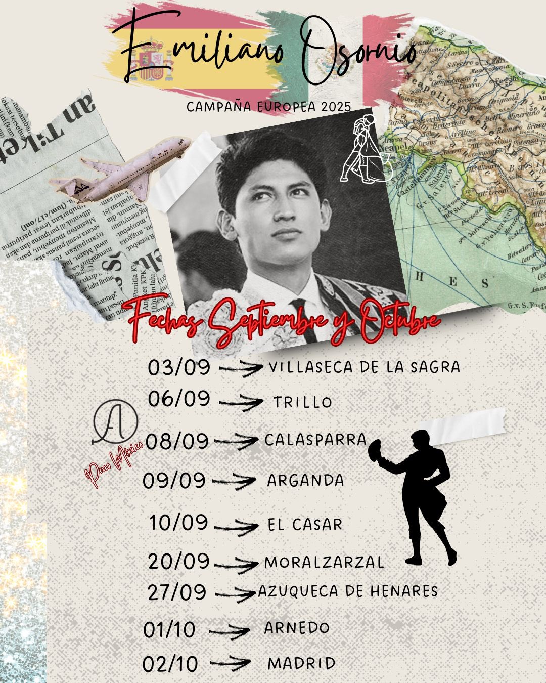 El joven novillero Emiliano Osornio afronta un mes de septiembre y comienzos de octubre cargados de compromiso en distintas plazas españolas dentro de su Campaña Europea 2025. En apenas cinco semanas, el mexicano recorrerá cosos de importancia en el circuito novilleril como Villaseca de la Sagra, Calasparra, Arganda o Moralzarzal, enclaves que marcan el pulso de la temporada para quienes buscan consolidarse como firmes promesas del toreo.