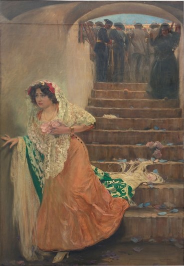 En esta pieza, representa el momento crítico en que un matador es atendido tras una cogida, destacando la vulnerabilidad del héroe taurino con un realismo conmovedor, un dibujo firme y una iluminación que enfatiza el pathos trágico y la dignidad humana. Esta pintura no solo demuestra su formación academicista bajo Carlos de Haes y Léon Bonnat, sino que también conecta con la tradición pictórica española de artistas como Ignacio Zuloaga o Roberto Domingo, aunque con una pincelada más contenida y serena.