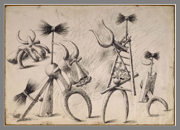 Benjamín Palencia. Composicón Tinta china sobre papel. Museo Reina Sofía En 1933 pinta Toros (Tauromaquia), hoy conservada en el Museo Nacional Centro de Arte Reina Sofía. El cuadro no busca el realismo fotográfico; busca el ritmo: manchas, tensiones, una atmósfera donde el toro aparece como energía más que como anatomía. Ese enfoque conecta con la experiencia de la Escuela de Vallecas: simplificar para llegar a lo esencial, convertir lo visible en símbolo. También en 1933 realiza obra sobre papel vinculada al tema, como Tres figuras (Tauromaquia), que muestra hasta qué punto el dibujo fue su herramienta favorita para “apuntar” movimiento y presencia.