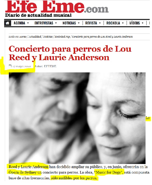Lou Reed y Laurie Anderson en concierto para perros: música de ultrasonidos solo audible para perros... Si la vida te ha dado posibles y puedes agasajar a tu mascota con majares exquisitos, muebles de diseños o "tiempo de ocio" en conciertos con primeras figuras de la canción mundial... estás en tu derecho.