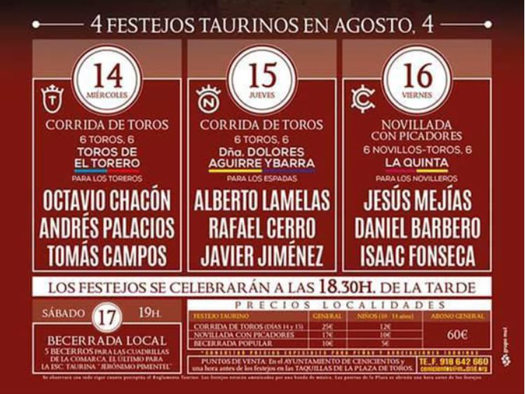 El pregón del martes arranca las fiestas de Cenicientos con fuegos artificiales y verbena. El miércoles a las 10.00 se desembarcan las reses, como el jueves y el viernes a la misma hora. El sábado hay becerrada a las 19.00 horas. Para los niños hay encierros infantiles fiesta del agua.
