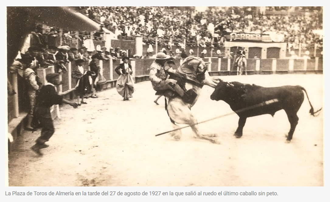 Almeria, 27 de Agosto de 1927. El toro “Corredor” de Alipio Perez-Tabernero cornea mortalmente al último caballo que salió sin peto al coso de Vilches. Lo lidió Marcial Lalanda. @JaviRatia