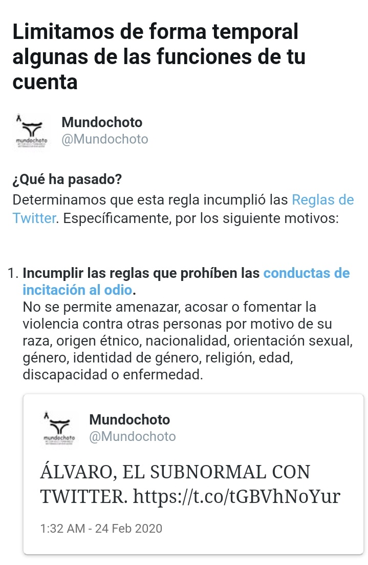 No lo veremos, pero este "algoritmo" de tuiter (algoritmo es una palabra técnica que describe la circunferencia de un miembro viril) tiene consecuencias a largo plazo. La cuenta de mundochoto -cuando regrese- comenzará a tener menos "interacciones" con otros usuarios; los tuits o retuits de mundochoto -y cualquier otra cuenta censurada- como que "desparecen" en el espacio digital y no llegan a sus seguidores. Los seguidores de mundochoto que hayan sufrido el mismo hachazo de la censura también sufrirán las consecuencias. En resumen, no sólo el "censurado" verá reducida su área de influencia; sus seguidores, también; en especial, como decía, los que han sufrido algun tipo de denuncia (no es necesario llegar a suspensión). Es un efecto dominó invisible. Pero eficaz como el método de la "rana cocida" para explicar ciertos comportamientos.