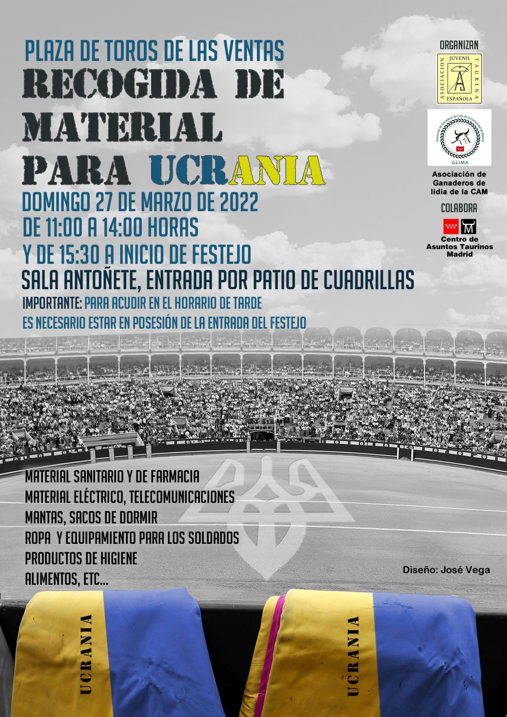 Para el domingo 27 de marzo. La AJTE -Asociación Juvenil Taurina Española- y la Asociación de Ganaderos de Lidia de la Comunidad de Madrid organizan una recogida de alimentos no perecederos y material sanitario y diverso para Ucrania. La entrega será de 11.00 a 14.00 horas y en horario de tarde*.