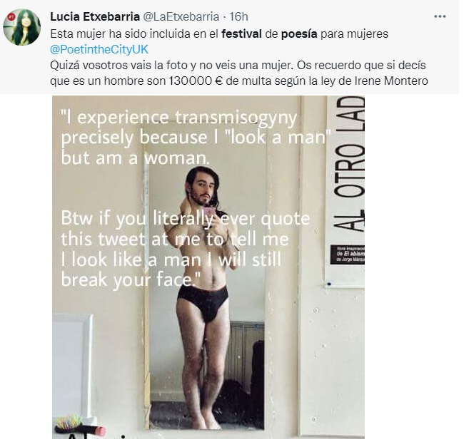 Esta mujer ha sido incluida en el Festival para Mujeres Poetas... si dices que no es una mujer, Irene Montero te puede multar hasta con 130.000 euros. ¿Vas a poner a Irene Montero a resolver temas reales en Las Ventas?