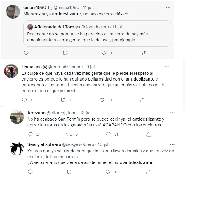 He leído por facebook que protestaban por el uso de antideslizante en las calles del encierro, que esto impedía caídas de los corredores y que por tanto, la carrera perdía emoción. Un poco brutos estos elementos de Madrid, no?