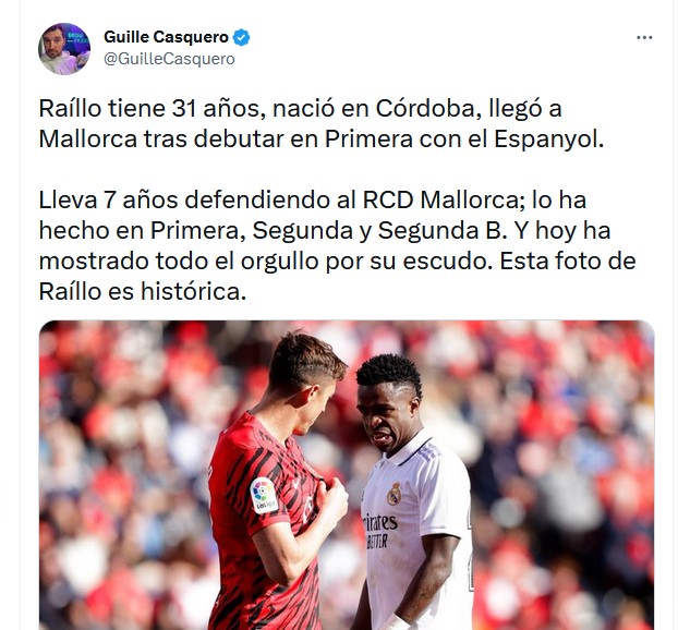 Esto va para esos periodistas mediocres, expertos en deportes, con 500 o 5.000 seguidores, que no son nadie, y piensan que insultando a Vinicius llegarán antes más lejos: esto es del jugador Maffeo del Mallorca,