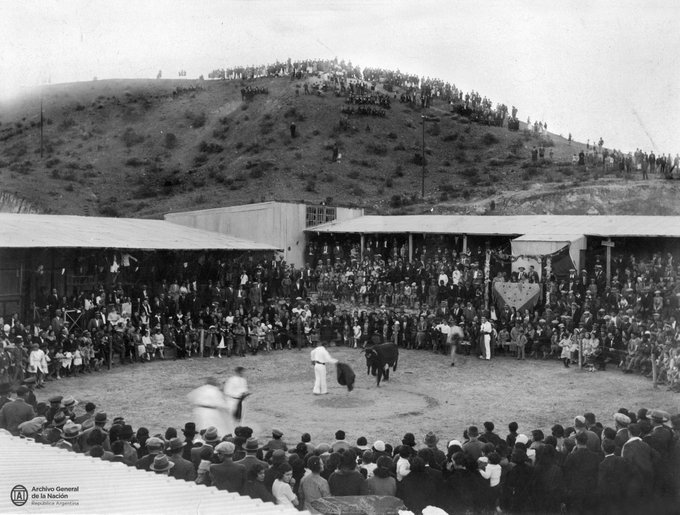 En Argentina pervivieron durante varias décadas llamas de afición y se organizaron corridas de toros, como esta en la localidad de Chaimán, en la provincia de Chubut, que dió una corrida de toros sin muerte en 1934. El público abarrotaba los tendidos, y puede atisbarse en lo alto de la montaña un numeroso público que también había acudido al reclamo de la corrida de toros.