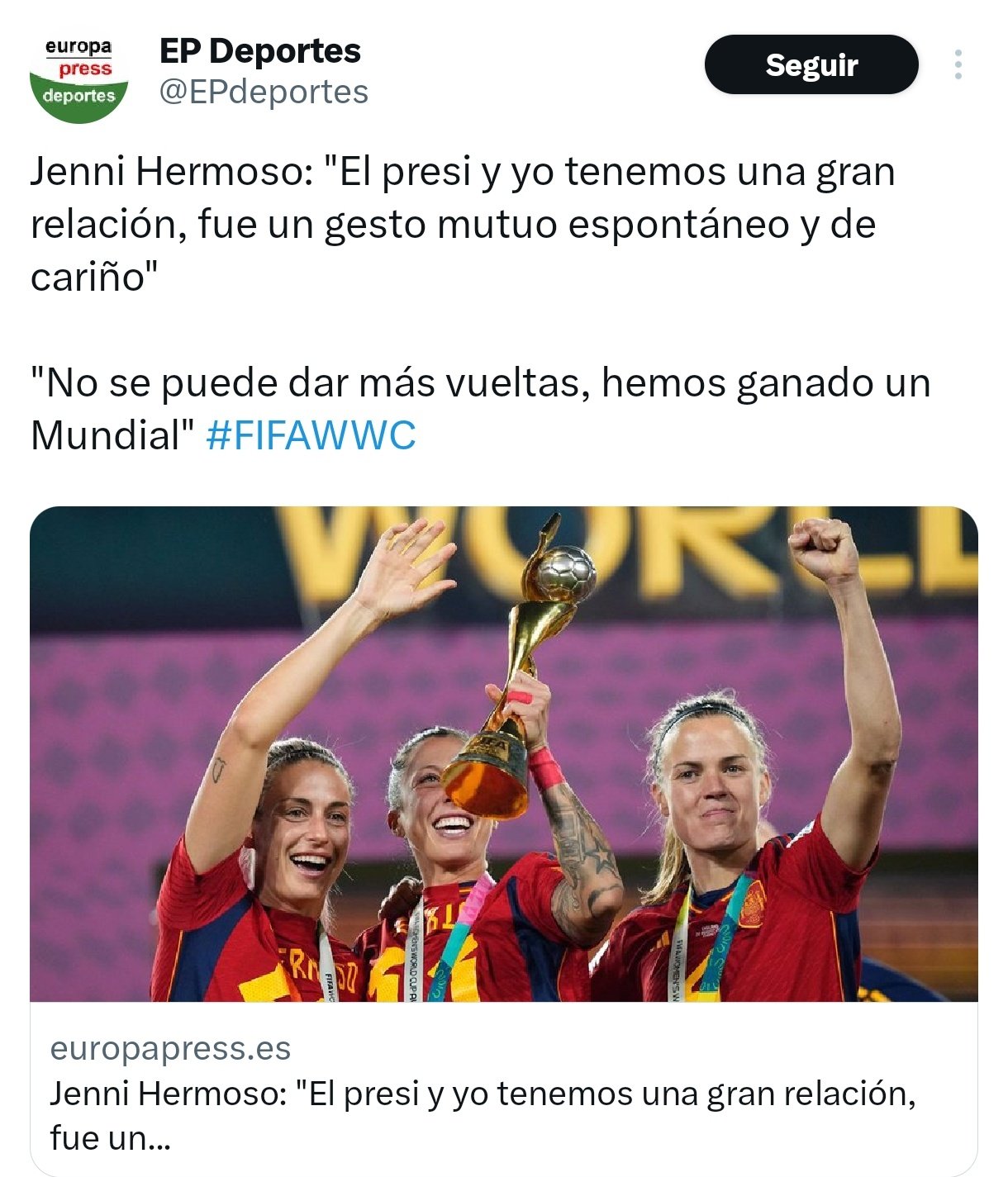 Rubiales tiene sus defensores, y muy bien situados, capaces de hacer mucha fuerza contra una jugadora de 33 años que está al final de su carrera y que solo quiere un último buen contrato. Aquí tenéis a una agencia de noticias defendiendo a Rubiales