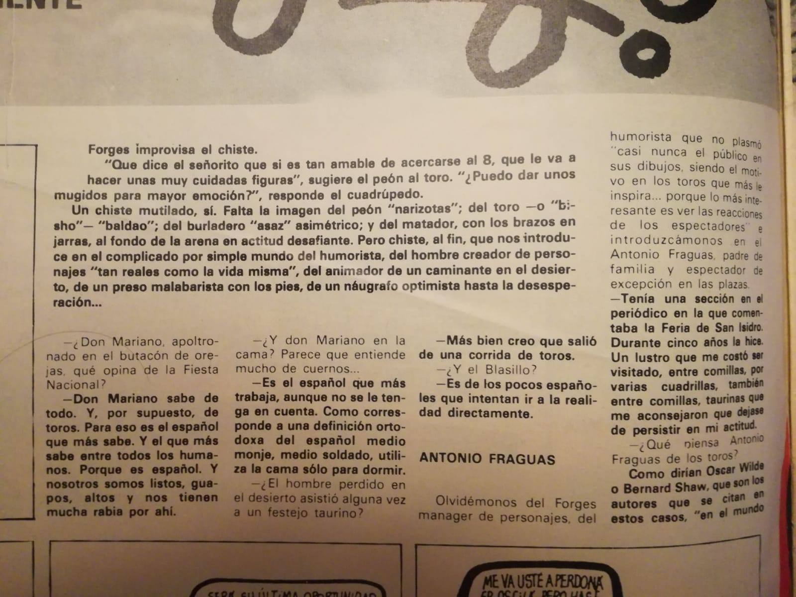 Humorista serio, y crítico taurino, también serio. Y antitaurino duro. No sabía si poner este tema del foro dedicado al insigne humorista en "Antitaurinos y animalistas" o en "Arte y Cultura" y felizmente he decidido dejarlo aquí, en "Arte y cultura", porque al fin y al cabo, Antonio Fraguas de Pablos, hijo y nieto de segovianos, guarda muy dentro un crítico, un crítico taurino: "que me costó ser visitado por varias cuadrillas que me aconsejaron que dejase de persistir en mi actitud".