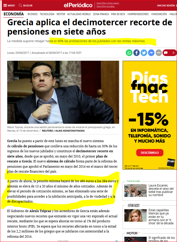 Llega la crisis de las pensiones, la misma que están padeciendo en Grecia, en silencio, desde hace unos años, y que se resume en este recorte del prensa tomado de El Periódico de Cataluña. Y así como la crisis de la construcción y de las hipotecas tuvo consecuencias gravísimas: paro, deuda, desahucios, etc., la que se avecina con las pensiones será otro tanto. Porque no hay dinero para tanta pensión; y ningún banco prestará dinero a España para el pago de pensiones sin garantía de devolución. Y en este drama ¿qué partido puede recortar las pensiones? Empezamos a hablar de elecciones.